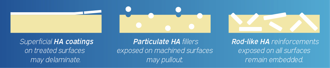 The Himed paper states that rod-like HA whiskers offer “materials with new and robust mechanical properties” and improve particle retention in surfaces for “properties that promote bone bonding,” [1]. Published studies have demonstrated that polymers, including PEEK, reinforced with rod-like HA whiskers exhibit significantly improved mechanical properties compared with spherical HA particles [2-4].