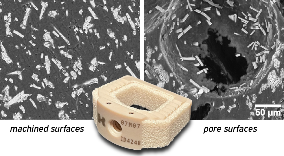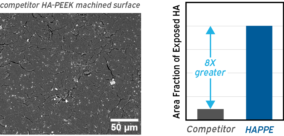 Furthermore, competitor HA impregnated PEEK products exhibit little HA exposure on machined surfaces, possibly because spherical HA particles are prone to pullout during machining [2]. The area fraction of exposed HA on machined surfaces of the HAPPE INTEGRATE®-C is ~8X greater, on average, compared to competitor implants, as measured in electron micrographs such as those here [5].