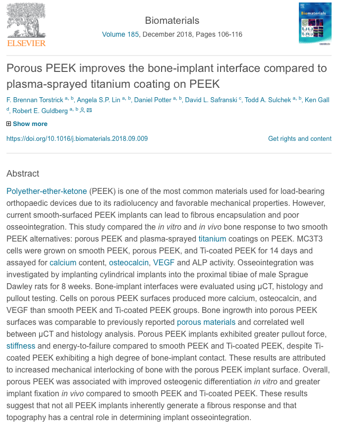 In this publication, the study compared the in vitro and in vivo bone response to two smooth PEEK alternatives: porous PEEK and plasma-sprayed titanium coatings on PEEK.